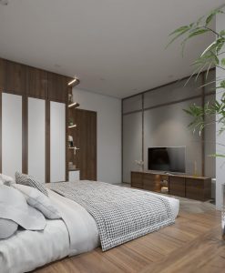 - Tông màu chủ đạo là vân gỗ. Với thiết kế giường trệt và tủ quần áo cánh lùa