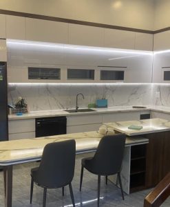 - Cánh tủ bếp nhựa Acrylic: Cũng sử dụng tấm nhựa PVC dày 1,8cm, phủ Acrylic mặt ngoài, và được đặt trực tiếp từ nhà máy của PICOMAT theo đúng kích thước của bản vẽ.
