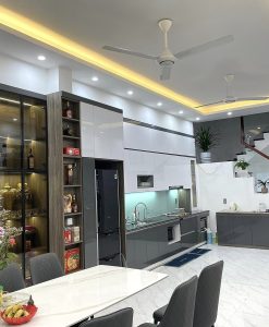 Tủ bếp Ninh Bình tủ bếp màu AC43+AC45 nhựa đặc cánh phủ Acrylic kết hợp kệ đựng rượu nhựa cao cấp Vincoplast HY89.