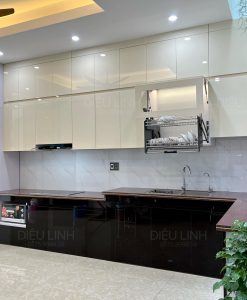 Tủ bếp Ninh Bình nhựa đặc cánh phủ Acrylic tủ trên màu vàng kem kết hợp tủ bếp dưới màu Black coffee.