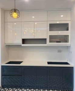 Tủ bếp cho diện tích nhỏ hẹp thi công tại Ninh Bình nhựa đặc cánh phủ Acrylic.