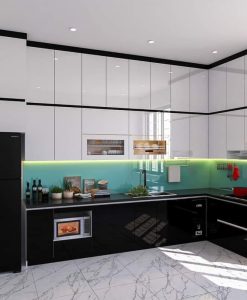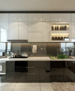 - Tủ bếp khung thùng nhựa đặc, cánh phủ Acrylic bóng gương với nhiều màu sắc lựa chọn