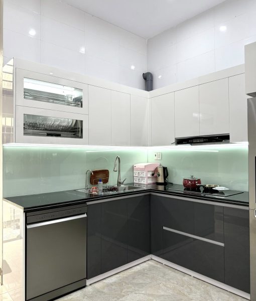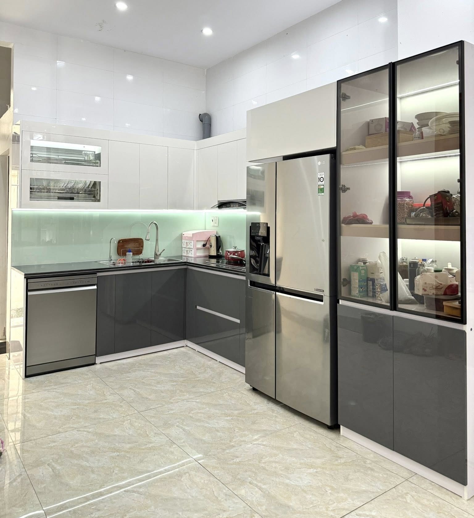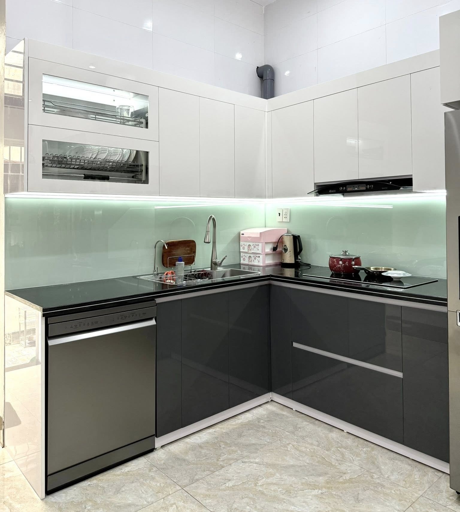 TBA219_Tủ bếp khung thùng nhựa đặc/ cánh nhựa đặc phủ Acrylic thi công tại Nam Bình/Ninh Bình.