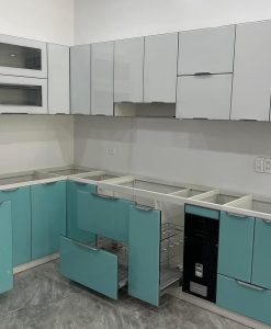 - Tủ bếp cánh kính chống nước tuyệt đối.