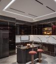 Tủ bếp inox cánh kính kết hợp bàn đảo sơ chế đồ ăn tiện dụng.