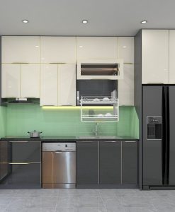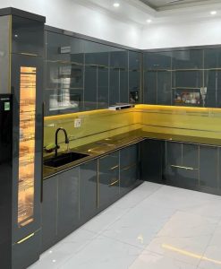Tủ bếp inox cánh kính màu ghi khung viền nhôm nguyên khối lắp đặt tại Ninh Bình.
