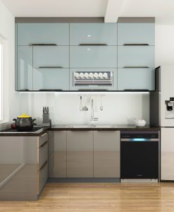 _ Tủ bếp inox cánh kính mẫu tủ bếp chữ L màu ghi