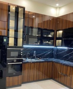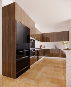Tủ bếp hợp kim nhôm cánh kính sơn màu giả gỗ lắp đặt tại Kim Sơn/Ninh Bình.