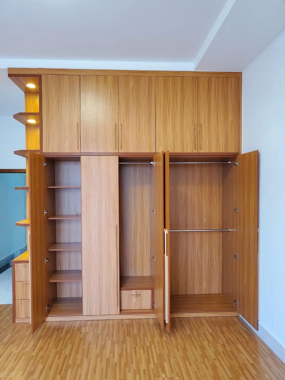 Tủ gỗ với không gian gồm 4 buồng to, 1 bên là kệ trang trí, ở trên nóc là 2 hộp cánh mở để đồ chăn/màn hoặc đồ ít dùng và các ngăn kéo nhỏ ở dưới.